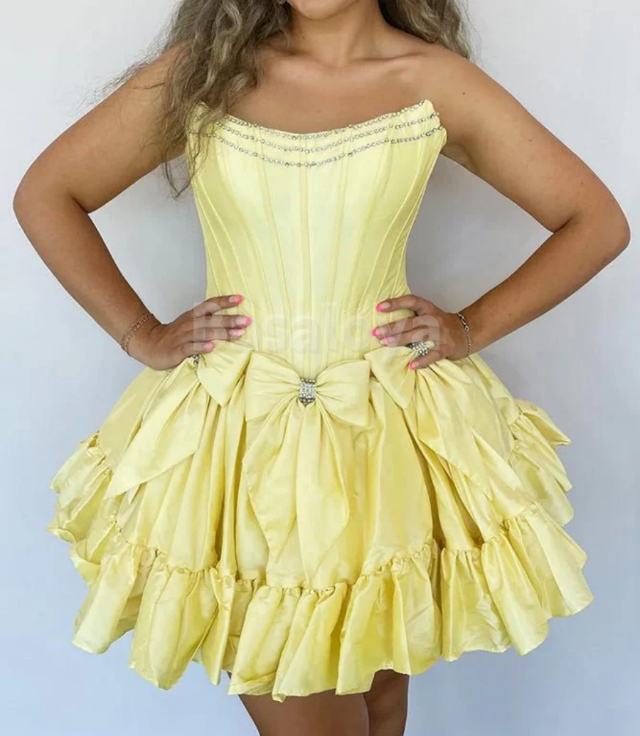 1.Design:A-Line,Strapless,Sleeveless,Bow,Beaded,Polyester,with padding and boning