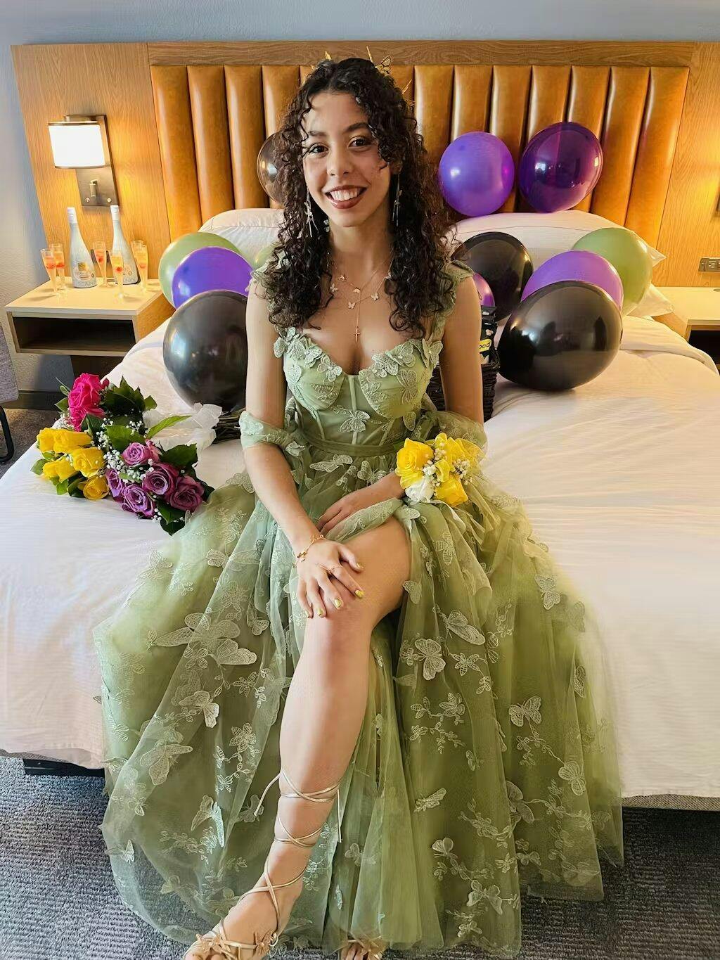 SP0130 Graceful 3D Butterfly Sage A-Line Sweetheart Prom Dress with Slit