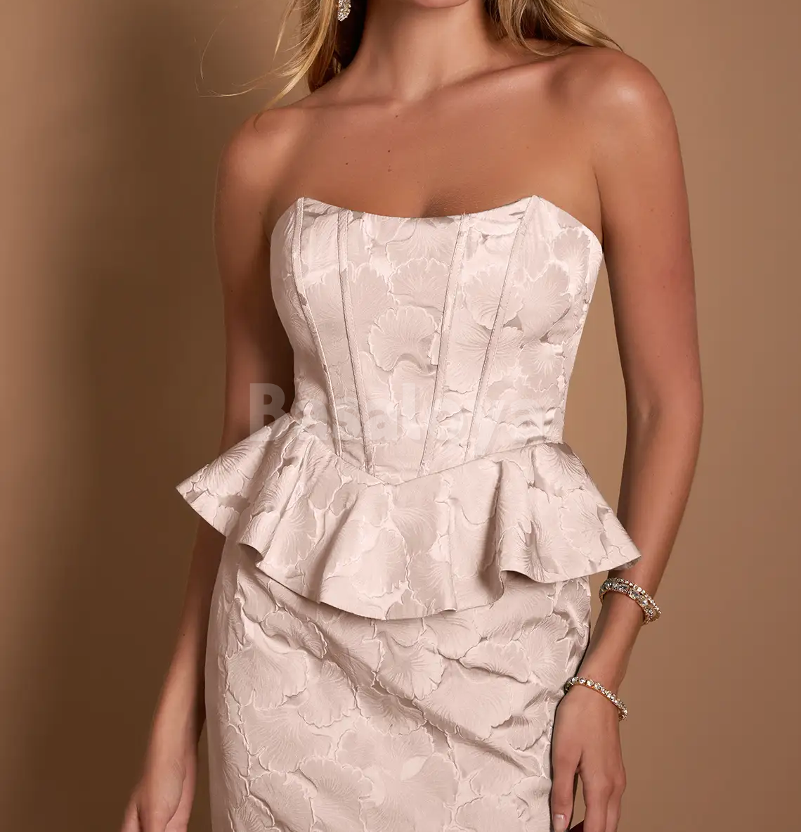 This elegant pink strapless mermaid gown features a graceful printed design that enhances its sophisticated silhouette. Its long, flowing cut accentuates your figure, making it an ideal choice for prom or formal events. Crafted to combine style with comfort, this dress ensures you stand out with refined charm at any party.