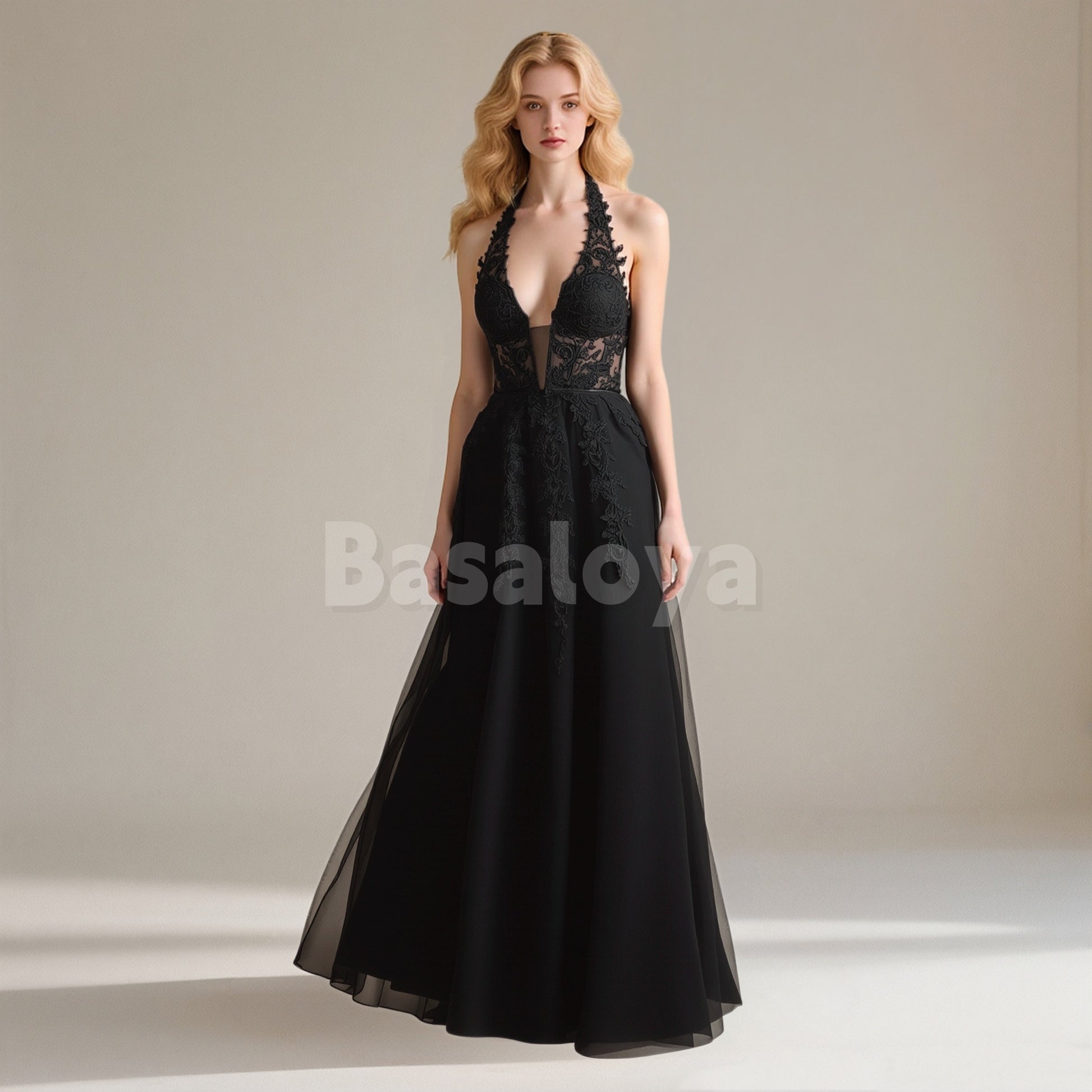 This elegant black halter prom dress features a flattering V-neckline and an A-line silhouette that enhances your figure gracefully. The long length adds sophistication, while delicate appliques provide subtle texture and visual interest, making it a perfect choice for formal occasions. Its design balances classic style with modern detailing for a timeless look.