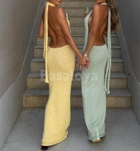 Turn heads at your next event in this stunning yellow halter maxi dress. The plunging V-neckline and form-fitting bodycon silhouette create an alluring, sophisticated look that flatters your figure. The halter design offers elegant support while the flowing maxi length adds dramatic movement and timeless elegance. Perfect for prom, formal galas, or upscale evening occasions, this dress combines modern sensuality with classic glamour. The vibrant yellow hue ensures you'll stand out while maintaining an air of refined confidence.
