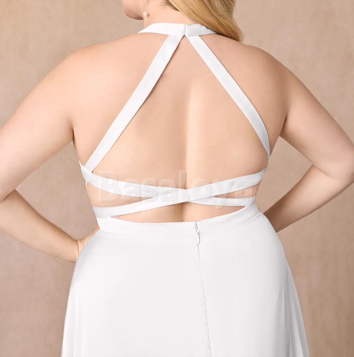 This WD0111 wedding gown features a minimalist white halter neck design that elegantly frames the shoulders. Its A-line silhouette flatters a variety of body shapes, while the subtle slit adds a touch of modern allure and ease of movement. Crafted for brides seeking understated sophistication, this bridal gown balances simplicity with graceful detail for a timeless look on your special day.