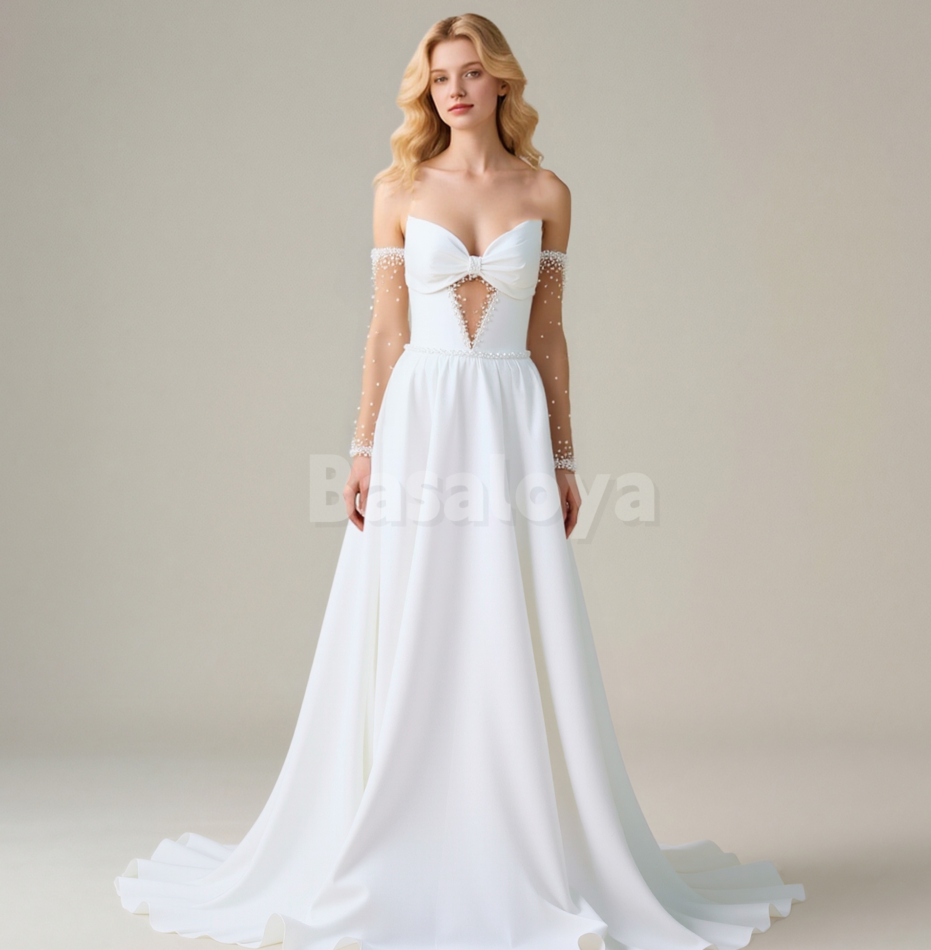 Elevate your bridal elegance with the WD0148 wedding gown featuring a timeless A-line silhouette complemented by delicate long sleeves. Crafted in luxurious white fabric, this gown is adorned with exquisite pearl embellishments that highlight its sweetheart neckline. Designed to offer both comfort and grace, it creates a flattering shape for a memorable walk down the aisle. Perfect for brides seeking refined sophistication and classic beauty on their special day.