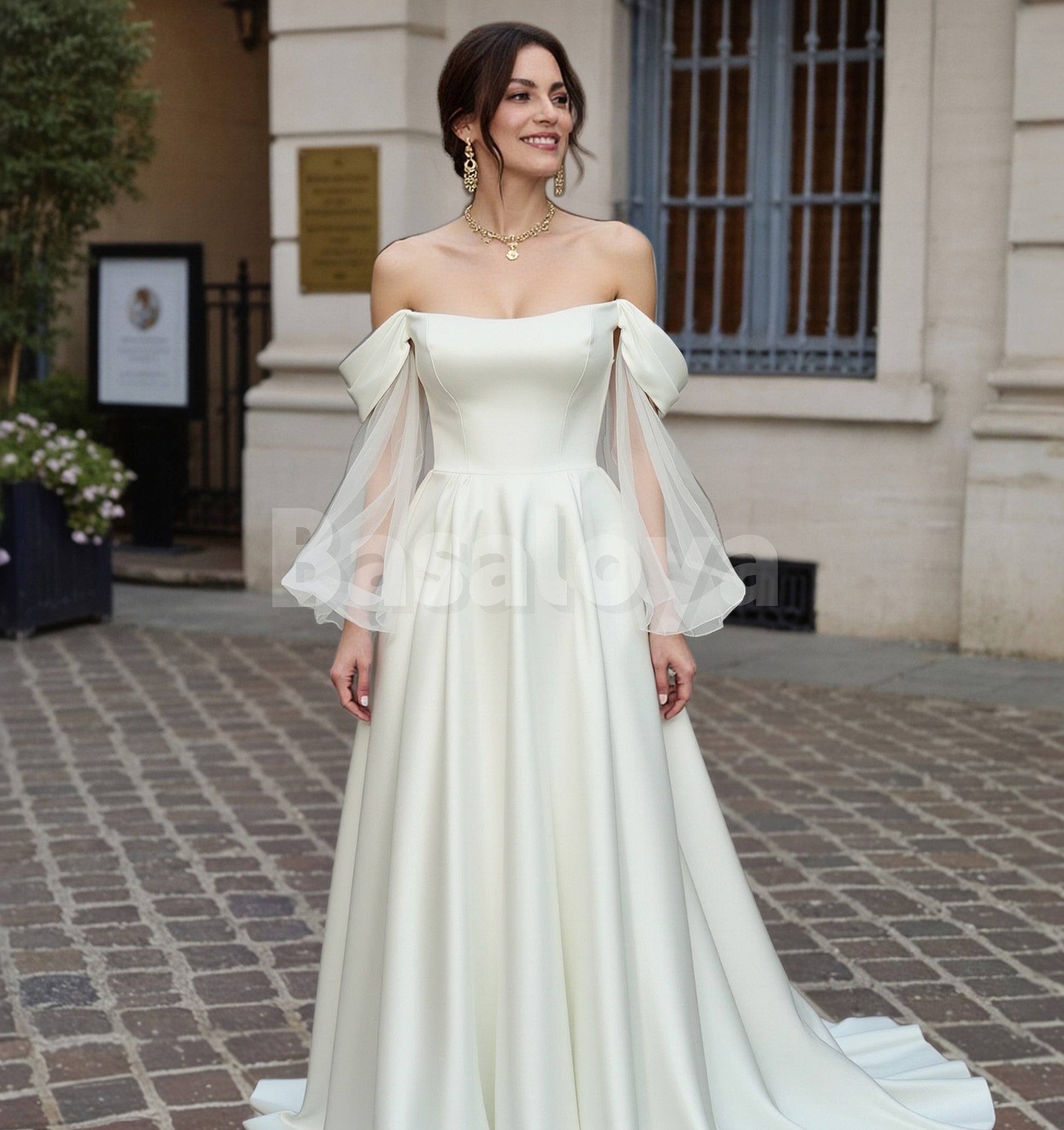 1.Design:Off-Shoulder,Long Sleeves,A-Line,Pleats,Slit,Polyester,with Padding and Boning